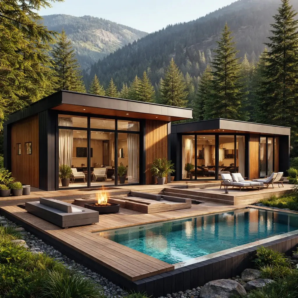 ویلاهای طرح چوب، کلبههای A-Frame و خانههای ییلاقی با سقفهای شیبدار تند، به راحتی قابل اجرا هستند. استفاده از ترموود (Thermowood) یا سایدینگهای طرح چوب روی دیوارهای پیشساخته، حسی کاملاً گرم و طبیعی به ویلا میدهد، در حالی که در دل دیوارها، تکنولوژی مدرن عایقبندی نهفته است.